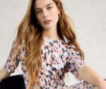 Then there are the details that give it personality. A black contracting collar frames the neckline, which dips into a V-shape with buttons you can adjust depending on your preference. Alison chose to fasten hers right up, leaving just two buttons undone, while the Next model shows how leaving a few more open creates a more relaxed feel. The puff sleeves have a slight ruched look, and the print itself puts a twist on the classic leopard – more of an abstract blur, with hints of blue and peach running through the pink. It gives the whole dress a fresh, slightly unexpected look that feels just right for spring and summer.