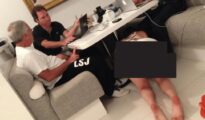 The photo shows men sitting around the table, a woman crawling underneath, and a disturbing painting (Image: Epstein files) A new photo from the Epstein estate shows a woman crawling under a table as Epstein More...