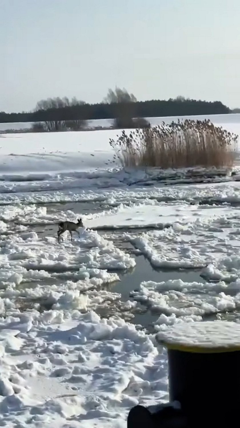Sarna na lodzie w pobliżu Kiezmarka. Lodołamacze ruszyły z pomocą